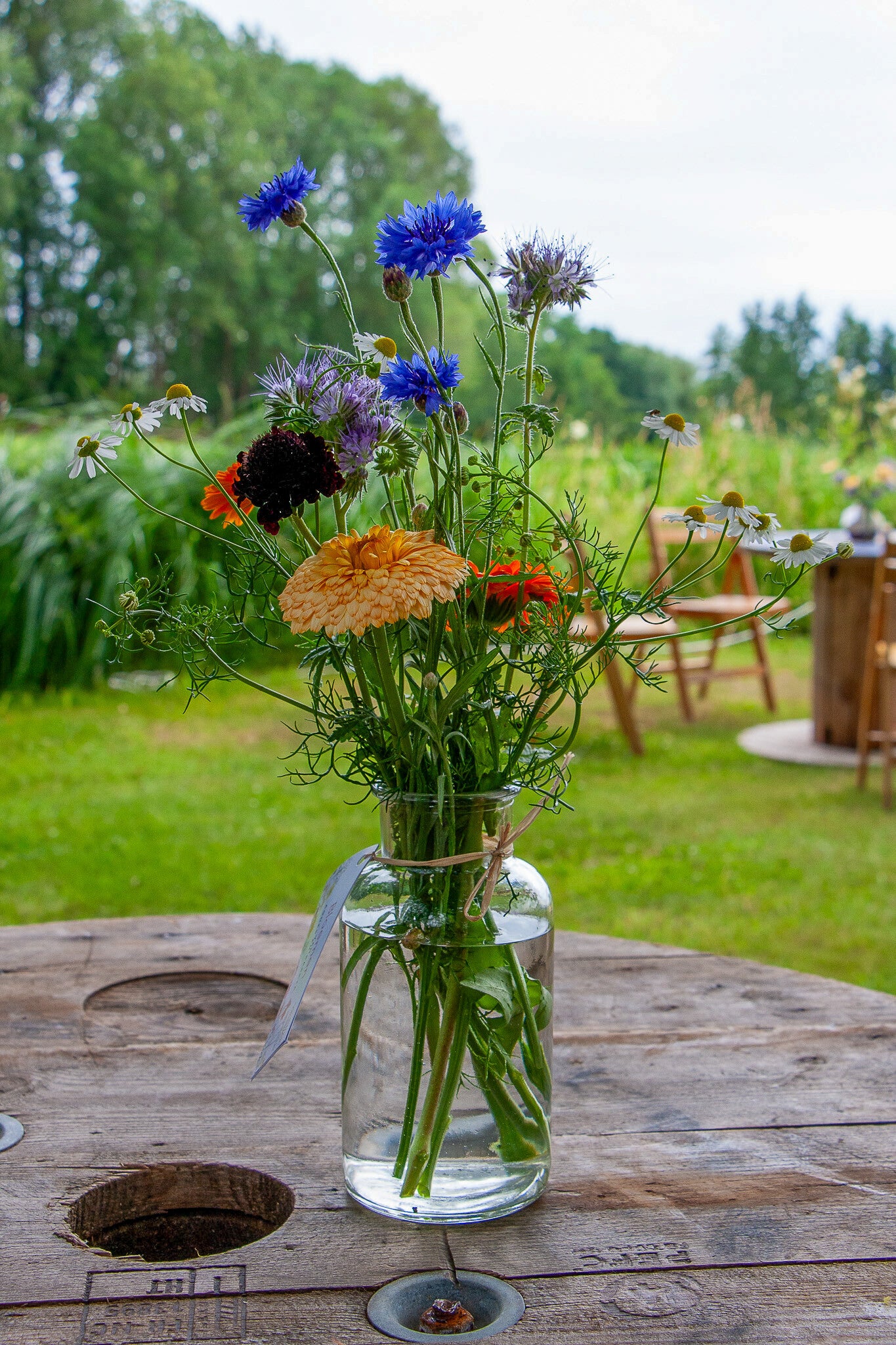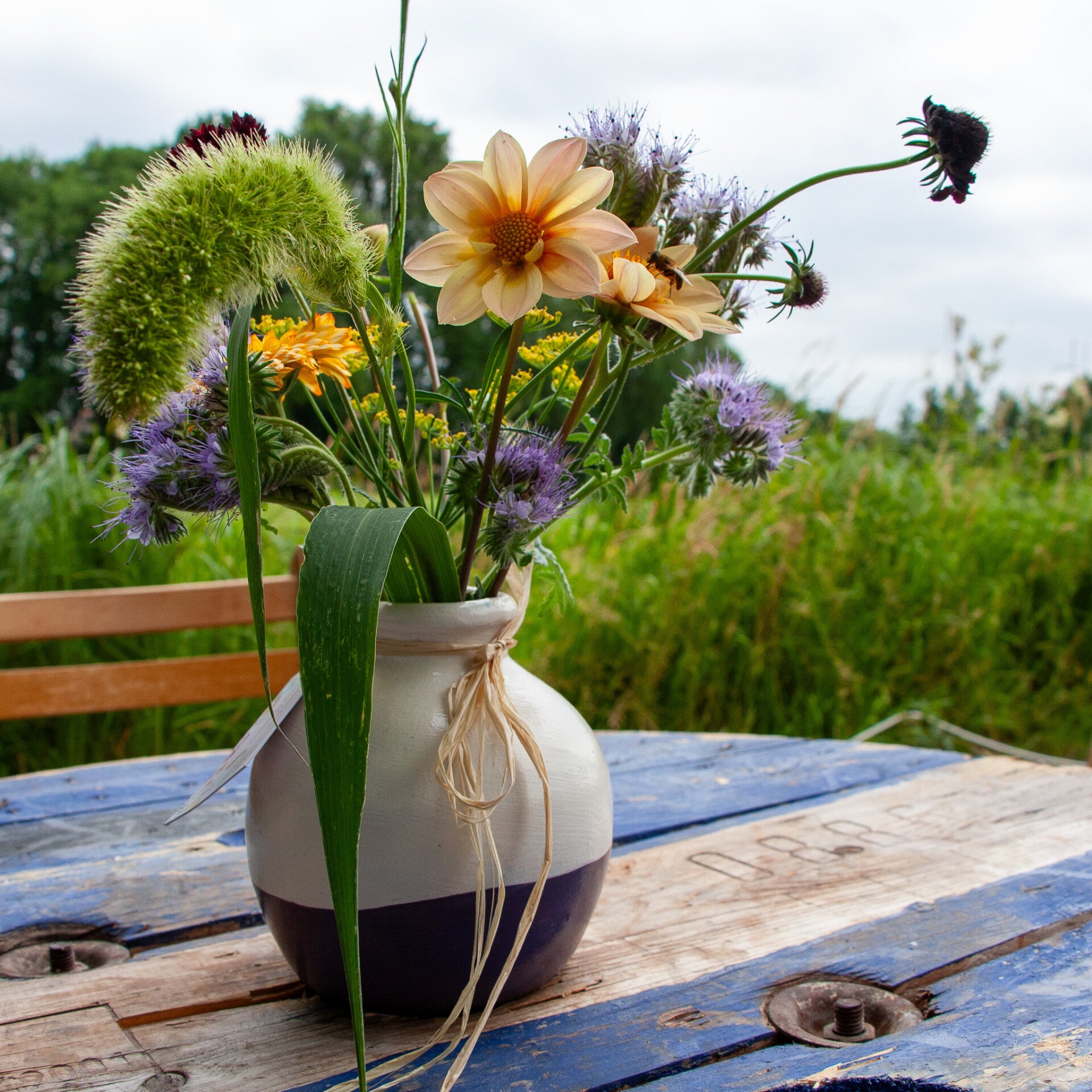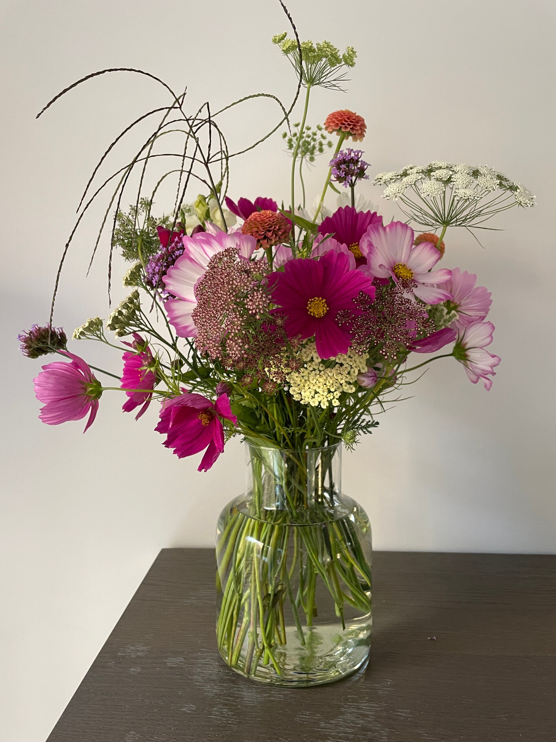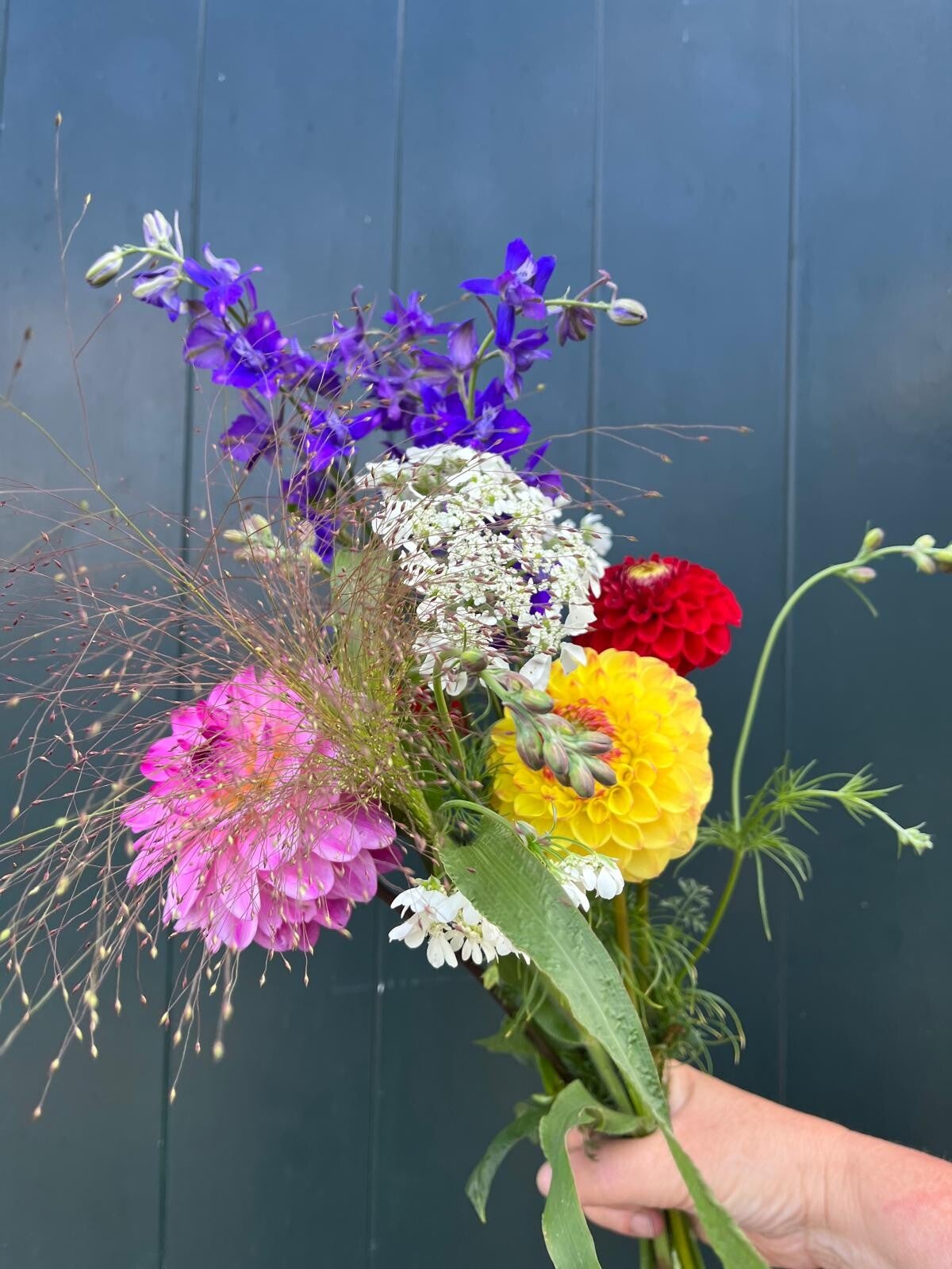 De samenstelling van onze boeketten verandert met het bloemenseizoen mee. In het voorjaar hebben de boeketten frisse, heldere kleuren zoals roze en blauw, met o.a. goudsbloemen, riddersporen en korenbloemen. In de zomer vind je in onze boeketten dahlia’s in mooie zachte zomertinten, aangevuld met schermbloemen, grassen en zinnia’s. In het najaar verschuiven de boeketten naar warme herfstkleuren zoals geel en oranje. Geen boeket is hetzelfde.